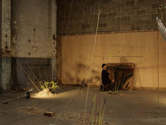 Rubble, leather dust, a fig tree, leather scraps, Goodyear welting thread, shoe sole rubber, oil on wood, oil on shoe sole rubber, oil on copper pipe, copper pipe, vices, fabric, discarded piano fragment, projected digital stop motion, and an audio recording of a piano improvisation.