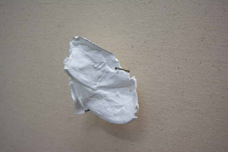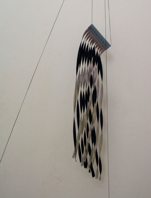 A misbehaving painting, Goodyear welting thread, nails, shoe sole rubber, suit fabric